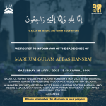 Marhuma Sakina bai Jaffer d/o Marhum Sherali Dhalla w/o Marhum Raza Hussein Dhalla on Sunday 22th October 2023 – 06 Rabi-ul-Thani 1445.