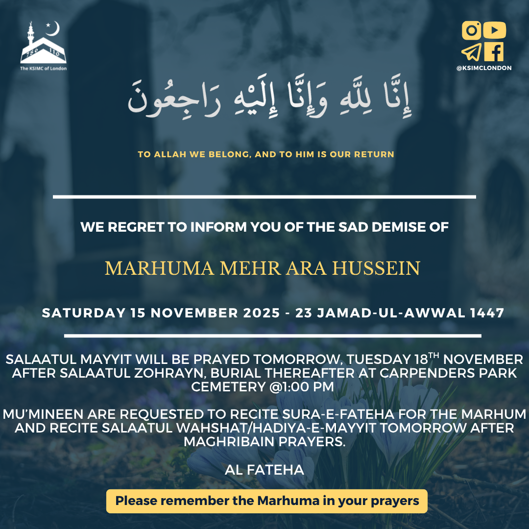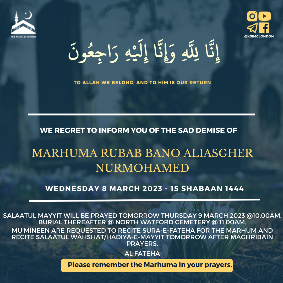 Salaatul Mayyit will be prayed tomorrow Friday 03 November 2023 @ 9:30am. Burial thereafter @ North Watford Cemetery, Watford, WD25 0AW @ 10:30am