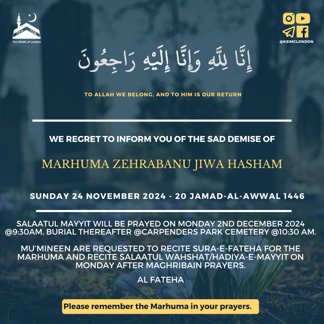Mu’mineen are requested to recite Sura-e-Fateha for the Marhuma and recite Salaatul Wahshat/Hadiya-e-Mayyit tomorrow after Maghribain prayers.