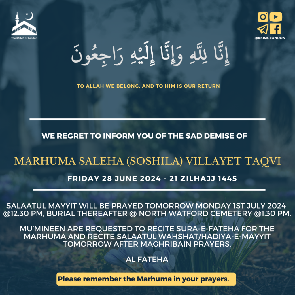 We regret to inform you of the sad demise of Marhuma Saleha (Soshila) Villayet Taqvi who passed away in London.