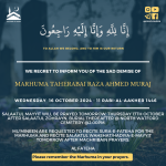 Mu’mineen are requested to recite Sura-e-Fateha for the Marhum and recite Salaatul Wahshat/Hadiya-e-Mayyit tomorrow after Maghribain prayers