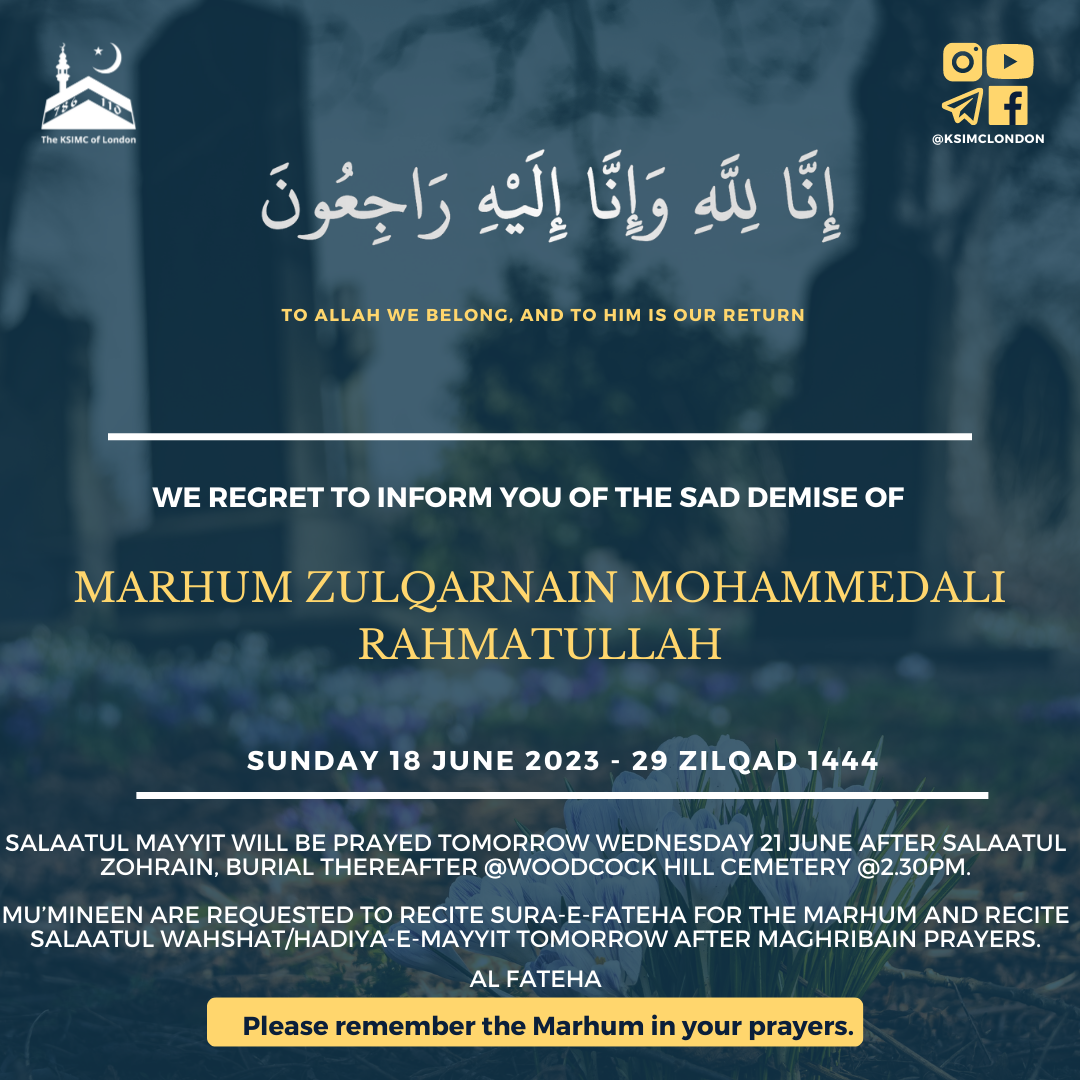 Mu’mineen are requested to recite Sura-e-Fateha for the Marhum and recite Salaatul Wahshat/Hadiya-e-Mayyit tomorrow after Maghribain prayers