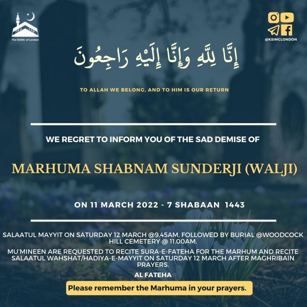 We regret to inform you of the sad demise of Marhuma Shabnam Sunderji (Walji) passed away today in London and will be buried tomorrow Saturday 12 March 2022. Salaatul Mayyit on Saturday 12 March @9.45am, followed by burial @Woodcock Hill Cemetery @ 11.00am.