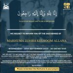 We regret to inform you of the sad demise of Marhuma Zarinabai Hudda of South London. Marhuma was the D/O Marhum Akberali Tarbhai Hudda and Marhuma Sugrabai Ladha Kassam of  South London.