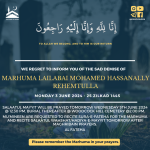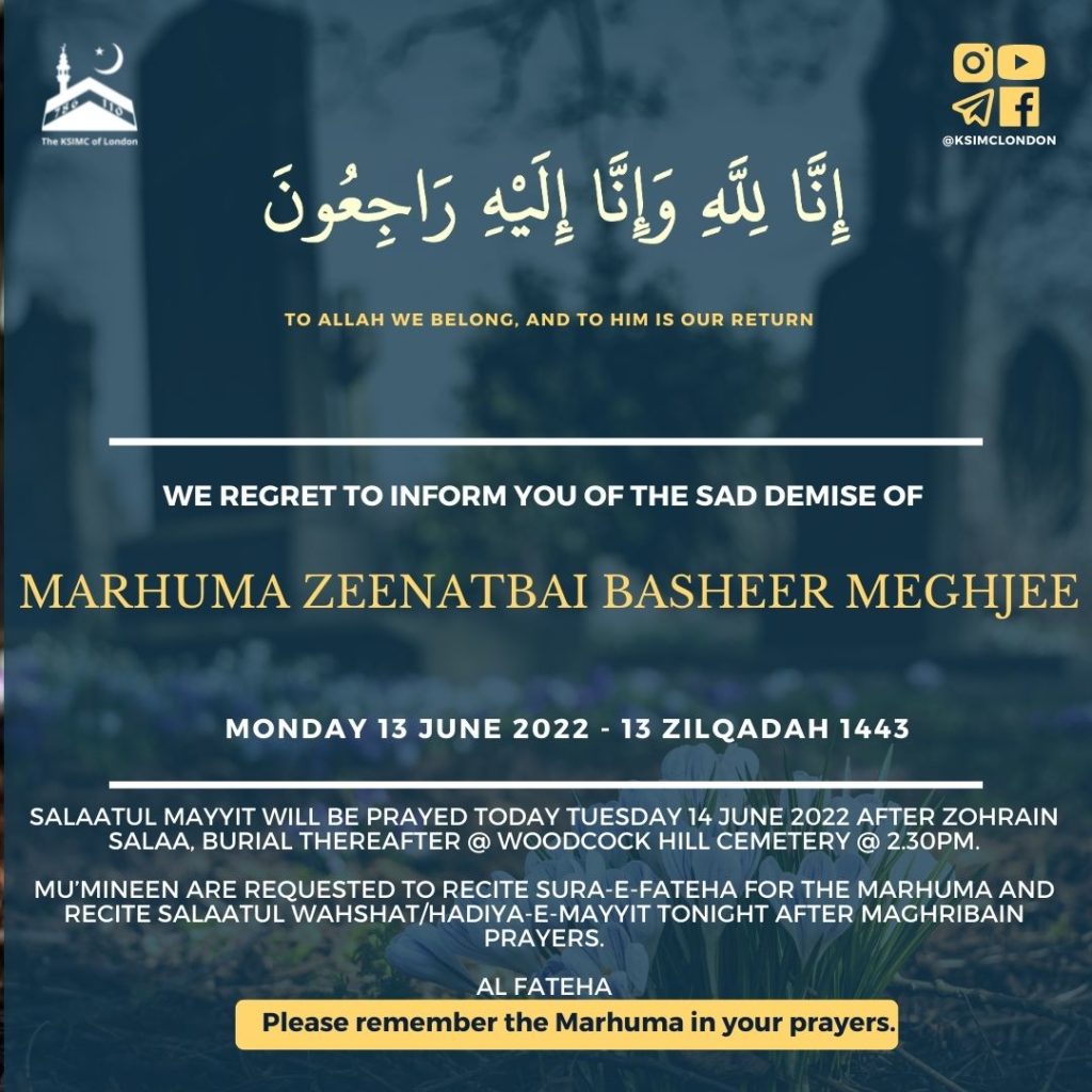 We regret to inform you of the sad demise of Marhuma Zeenatbai Basheer Meghjee passed away today in London and will be buried today Monday 13 June 2022.