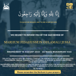 Mu’mineen are requested to recite Sura-e-Fateha for the Marhuma and recite Salaatul Wahshat/Hadiya-e-Mayyit tonight after Maghribain prayers.
