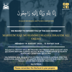 Salaatul Mayyit will be prayed after Salaatul Zohrain today Tuesday 14 June 2022 thereafter burial at Woodcock Hill Cemetery @ 2.30pm