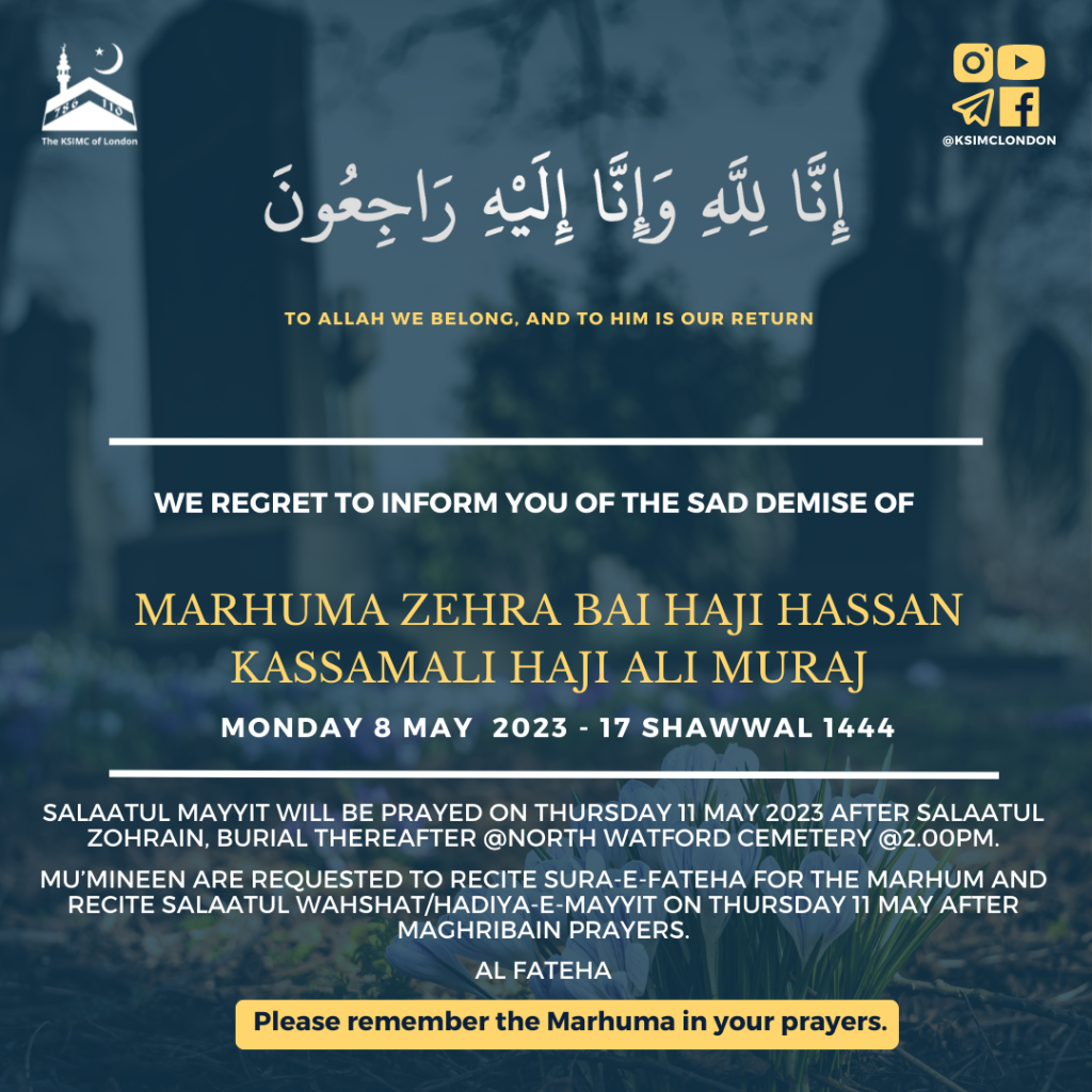 We regret to inform you of the sad demise of Marhuma Zehra bai Haji Hassan Kassamali Haji Ali Muraj W/O Nazerali Mohamedali Ahmed who passed away in London.