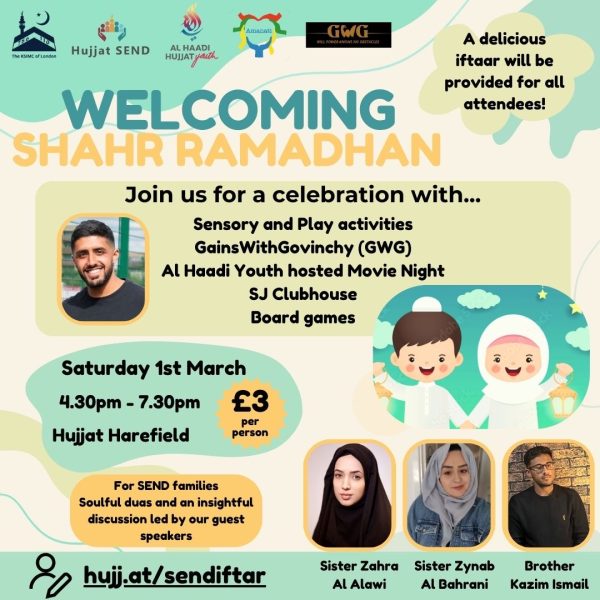 🌙All SEND families are invited to join us in welcoming Shahr Ramadhan! ⏰ 4:30-7:30pm 📍 Hujjat Harefield 🗓️ Saturday 1st March 2025 Kids: -Sports with Govinchy -multisensory carousel activities -physical play area -Al Haadi hosted…